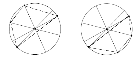 در دایرهای $n$ قطر مختلف رسم شده است. هر قطر دو نقطهی انتهایی دارد (نقاط تلاقی قطر با دایره)٬ پس در مجموع $2n$ نقطه انتهایی داریم. یک مجموعهی «متعادل» مجموعهای از $n$ نقطهی انتهایی است بهگونهای که دقیقاً یکی از دو نقطهی انتهایی هر قطر در این مجموعه باشد٬ و علاوه بر آن٬ اگر یک $n$ضلعی ساده رسم کنیم که رئوس آن٬ نقاط عضو این مجموعه باشند٬ مرکز دایره داخل این $n$ ضلعی قرار گیرد. (منظور از $n$ ضلعی ساده٬ شکلی است با $n$ راس و $n$ ضلع که اضلاع آن فقط در رأسها با یکدیگر برخورد میکنند).