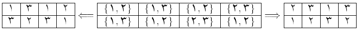 یک جدول «مجموعهای »٬ جدولی با ۲ سطر و $n$ ستون ($2 \le n$) است که در هریک از $2n$ خانهی آن یکی از ۳ مجموعهی {۱٫۲}٬ {۱٫۳} و یا {۲٫۳} نوشته شده است. دو خانه از جدول را «مجاور» مینامیم اگر در یک ضلع مشترک باشند. همچنین فرض میکنیم خانهی اول هر سطر و خانهی $n$ام همان سطر مجاور هستند. (بنابراین هر خانهی جدول دقیقاً با سه خانهی دیگر مجاور است.)