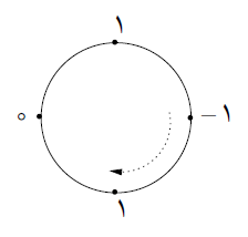 $n$ عدد حقیقی ($1 \le n$) روی یک دایره نوشته شدهاند. مجموع این اعداد ۱ است. از یک عدد دلخواه روی دایره شروع میکنیم و به ترتیب ساعتگرد٬ اعداد را میخوانیم. $n$ عدد خوانده شده را به ترتیب در $1^3$ , $2^3$ , … و $n^3$ ضرب میکنیم. این $n$ عدد را باهم جمع میکنیم. مثلاً در شکل زیر $n=۴$ است.