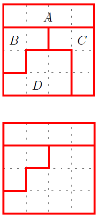 یک جدول $n \times n$ در اختیار داریم. در ابتدا جدول از $n^2$ ناحیه تشکیل شده است ($n^2$ مربع $۱ \times ۱$). در هر مرحله می‌توانیم تمام دو ناحیه‌ی مجاور (یعنی دو ناحیه که لااقل یک پاره‌خط مشترک دارند) را از جدول انتخاب کنیم و این دو ناحیه را با هم ادغام کنیم؛ یعنی مرز مشترک بین این دو ناحیه را پاک کنیم. فرض کنید طول این مرز مشترک در مرحله‌ی $i$ام $a_i$ باشد. اگر بعد از $k$ مرحله٬ تنها یک ناحیه باقی بماند (یعنی یک مربع $n \times n$٬ اعداد $a_۱,...,a_k$ به دست می‌آیند. برای مثال٬ در شکل سمت چپ بالا اگر نواحی $D$ و $C$ را بخواهیم با هم ادغام کنیم٬ محیط مشترک بین این دو ناحیه ۳ واحد بوده و نهایتاً به شکل پایین می‌رسیم.