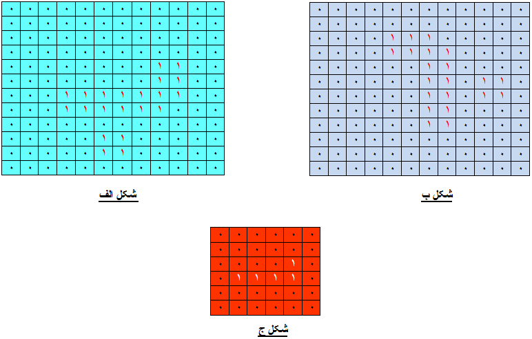 یک ماتریس $12 \times 12$ متشکل از اعداد صفر و یک را در نظر بگیرید. هر سطر این ماتریس را میتوان به عنوان یک عدد ۱۲ رقمی در مبنای ۲ در نظر گرفت که با تبدیل آن به مبنای ۱۰ یک عدد صحیح نامنفی به دست میآید. با تبدیل این عدد به مبنای ۲ و در صورت لزوم افزایش ارقام از سمت چپ تا ۱۲ رقم دوباره میتوان به سطر ماتریس دست یافت. در ماتریس فوق ارقام ۱ شکلی را به وجود میآورند، (مانند شکل الف). ماتریس فوق را «۹۰ درجه دوران یافته» مینامیم در صورتی که شکل داخل آن نسبت به مرکز ماتریس، ۹۰ درجه در جهت مثبت مثلثاتی دوران داده شود، (مانند شکل ب). ماتریس فوق را «فشرده شده» مینامیم در صورتی که هر ماتریس $2\times 2$ داخل آن را با شرایط زیر به یک درایه تبدیل کنیم. در صورتی که تعداد درایههای مساوی ۱ یک ماتریس $2\times 2$ داخلی بیشتر از یک باشد آن ماتریس را به یک درایهی ۱ و در غیر این صورت به یک درایهی صفر تبدیل میکنیم، (مانند شکل ج). (ماتریسهای $2 \times 2$ را از گوشه سمت چپ و بالا در نظر میگیریم).