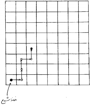 یک صفحه شطرنج $(8\times 8)$ را در نظر بگیرید. یک مهره در خانهی سمت چپ و پایین این صفحه قرار دارد. این خانه را «خانهی شروع» مینامیم و با مختصات $(1,1)$ نمایش میدهیم. مهرهی فوق را، در هر بار حرکت، فقط میتوان یا یک خانه به سمت راست و یا یک خانه به سمت بالا حرکت داد. برنامهای بنویسید که کلیهی مسیرهای ممکن برای رسیدن این مهره از خانهی شروع به خانهای با مختصات $(i,j)$ را تولید کند. هر مسیر با دنبالهای از $R$ و $U$ مشخص میشود که در آن هر حرکت به سمت راست با $R$ و هر حرکت به سمت بالا با $U$ نشان داده میشود.