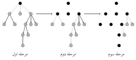 در حقیقت در هر مرحله می توان بر روی هر درخت ریشه دار باقی مانده، هر یک از عملیات اول یا دوم را انجام داد. دقت کنید که با پاک شدن یال ها، هر درخت ریشه دار به یک یا چند درخت ریشه دار تبدیل می شود. برای مثال در شکل تمام یال های درخت اولیه در ۳ مرحله پاک شده اند. در این شکل ریشه ی درخت ها با رنگ سیاه نشان داده شده اند. دقت کنید که بعد از مرحله ی اول درخت ریشه دار اولیه با ۱۲ راس، به ۴ درخت ریشه دار با ۳، ۱، ۱ و ۷ راس تبدیل شده است.