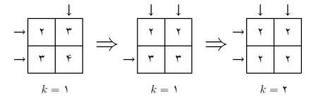 در مثال زیر تمام اعداد یک جدول جادویی $۲\times۲$ در سه مرحله صفر شده اند. زیر مجموعه های $ S$ و $T$ توسط پیکان در شکل نشان داده شده اند.