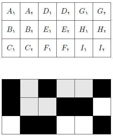 جدول مقابل شامل ۹ خانه‌ی زوج می‌باشد که با حروف مشابه (به عنوان مثال $A_1$ و $A_2$) مشخص شده‌اند. از هر زوج خانه دقیقا یکی را سیاه می‌کنیم تا در پایان ۹ خانه از ۱۸ خانه سیاه باشند.