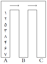 در پارکینگ خیکول‌آباد ۸ ماشین که با اعداد ۱ تا ۸ شماره‌گذاری شده‌اند، مطابق شکل در راهروی $A$ قرار دارند. در هر مرحله یا بالاترین ماشین راهروی $A$ وارد یکی از راهروهای $B$ یا $C$ می‌شود، یا بالاترین ماشین راهروی $B$ وارد راهروی $C$ می‌شود. فرض کنید در انتها تمام ماشین‌ها در ستون $C$ باشند. در این صورت تعداد جفت اعداد متوالی در ستون $C$ که حاصل جمعشان مضرب ۳ است حداکثر چند است؟