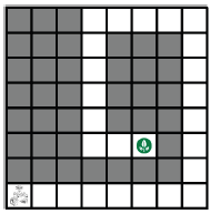 جدول زیر را در نظر بگیرید. خانههای خاکستری غیر مجاز هستند. طول کوتاهترین برنامهای که ربات با اجرای آن حداقل یک بار به خانهی هدف (انتهای مسیر سفید) میرسد٬ چند است؟