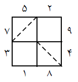 در جدول روبه‌رو می‌توانیم با کشیدن هریک از دو قطر هر خانه٬ یک آینه‌ی دو‌طرفه در آن خانه قرار دهیم. در واقع برای هر خانه سه حالت متصور است. یا آینه‌ای درون آن نیست و یا اینکه یکی از قطر‌های آن کشیده شده است. برای مثال در شکل روبه‌رو دو آینه که با خط‌چین مشخص شده‌اند در جدول وجود دارند. به ازای هر وضعیت جدول٬ مقدار آن وضعیت به این صورت تعیین می‌شود که هر دو عددی که همدیگر را می‌بینند (با توجه به آینه‌ها) در هم ضرب می‌کنیم و مجموع این حاصل ضرب‌ها٬ مقدار آن وضعیت جدول را مشخص می‌کند (دید اعداد به گونه‌ای است که در صورتی که آینه‌ای وجود نداشته باشد هر عددی٬ عدد مقابل خود را می‌بیند). برای مثال مقدار وضعیت روبه‌رو به این صورت محاسبه می‌شود: $1 \times 9 + 3 \times 8 + 2 \times 4 + 5 \times 7 = 76$ .
