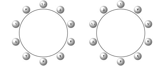 ده توپ با شماره‌های $1$ تا $10$ به ترتیب دور یک دایره قرار دارند. در هر مرحله می‌توان دو توپ مجاور مانند $A$ و $B$ در نظر گرفت و آن‌ها را به همان ترتیب در میان دو توپ مجاور دیگر قرار داد. برای مثال با برداشتن توپ‌های $1$ و $3$ و گذاشتن آن‌ها در میان دو توپ $5$ و $7$ می‌توان از شکل سمت چپ به شکل سمت راست رسید: