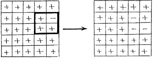 یک مربع $5\times 5$ خانه را در نظر بگیرید. در یکی از خانهها علامت «$-$» و در بقیه علامت «$+$» گذاشتهایم. یک بازی با قانون زیر تعریف میکنیم: