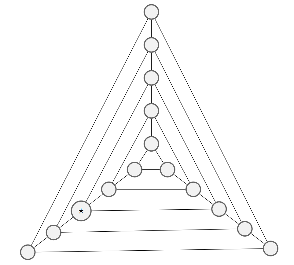 مدتی است تبلیغات انتخاباتی در کشور مثلث شروع شده است؛ دکتر مسلط با شعار «آیندەی مثلث، نیازمند تسلط»، در انتخابات ثبتنام کرده است و ستاد انتخاباتی او در حال برنامەریزی برای سفر تبلیغاتی شهریاش میباشند. کشور مثلث شامل ۱۵ شهر است که شکل زیر اتصالات میان این شهرها را نشان میدهد. دکتر مسلط در شهر $⋆$ زندگی میکند. او که قرار است از فردا سفرش را شروع کند، در ابتدای هر روز به یکی از شهرهای مجاورش میرود و در آنجا سخنرانی میکند. ستاد انتخاباتی او میخواهد مسیر حرکتی دکتر مسلط را طوری انتخاب کند که او در هر شهر فقط یک بار سخنرانی کند و آخرین سخنرانیاش در شهر $⋆$ باشد. چند مسیر متفاوت وجود دارد که این ستاد انتخاباتی میتواند انتخاب کند؟