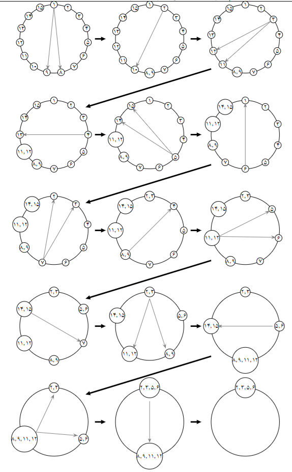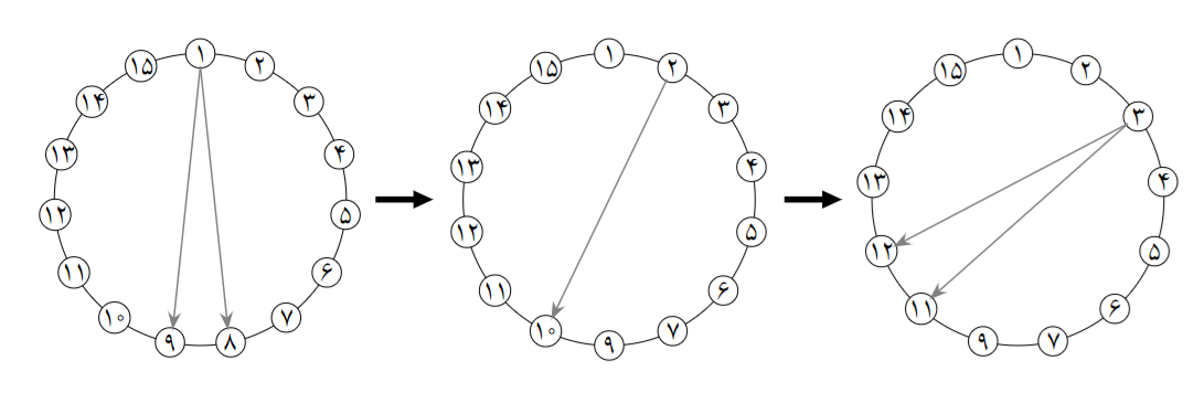 $15$ نفر با شمارههای $1$ تا $15$، مانند دایرهی سمت چپ شکل زیر، با فاصلههای یکنواخت، بهترتیبِ ساعتگرد دورِ یک دایرهایستادهاند تا مراسم ویژهای را اجرا کنند. این مراسم از تعدادی مرحله تشکیل شده است و در هر مرحلهی آن، کسی که نوبتش است (با شروع از فردِ شمارهی $1$ در نخستین مرحله)، بهصورت زیر عمل میکند: