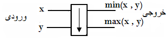 این مقایسه کننده دو عدد را به عنوان ورودی دریافت کرده، عدد کوچکتر را در خط اول خروجی خود و عدد بزرگتر را در خط دوم خروجی قرار میدهد. با وصل کردن تعدادی از این مقایسه کنندهها بر اساس یک نظم خاص میتوان یک «مدار مرتبکننده» سخت بطوری که تعدادی عدد (از ورودی دریافت نموده و سپس از تعدادی عمل مقایسه این اعداد را به صورت مرتب در خروجی قرار دهد. به عنوان مثال شکل زیر یک مدار مرتبکننده با چهار ورودی را نشان میدهد: