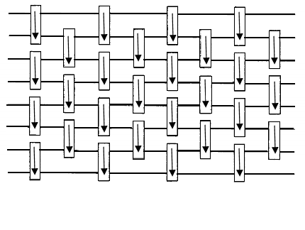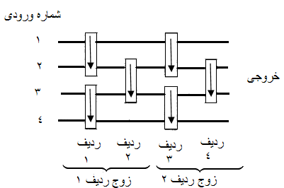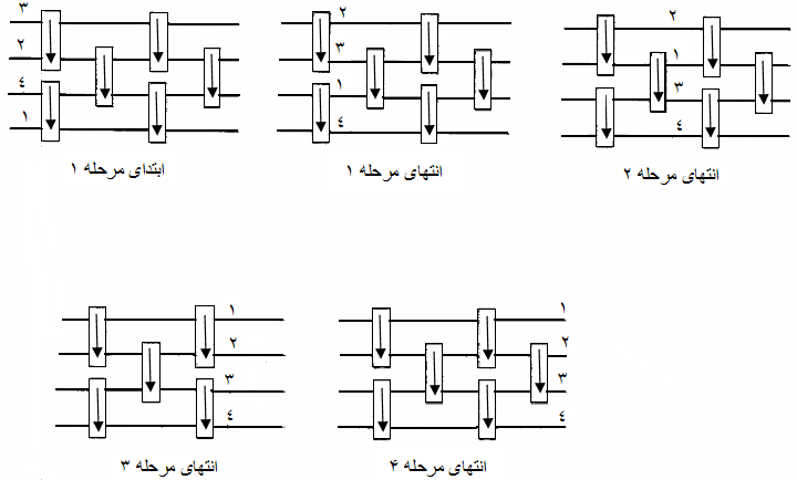 ب) ثابت کنید که مدار مرتبکنندهی $n$ تایی با تعداد زوج ردیفهایی که در قسمت الف حدس زدهاید، کلیهی جایگشتهای ورودی از اعداد صفر و یک را مرتب میکند. در این قسمت باید حدس بند الف را برای ورودیهای صفر و یک بطور کامل اثبات نمایید.