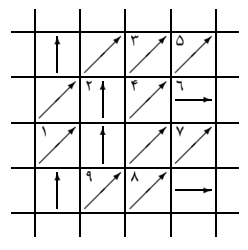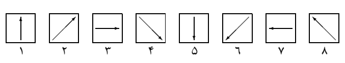 الف) از یک خانهی دلخواه این جدول شروع به حرکت میکنیم و در هر مرحله٬ به یکی از خانههای مجاور خانهای که در آن هستیم٬ میرویم. با توجه به شرایط مسئله٬ جهت فلش خانهای که به آن میرویم نسبت به جهت فلش خانهای که در آن هستیم٬ به اندازهی ۴۵-٬ ٬۰ یا ۴۵ درجه در جهت عقربههای ساعت اختلاف دارد. مقدار این اختلاف درجه را یادداشت میکنیم. برای مثال٬ اگر شکل زیر نشاندهندهی قسمتی از جدول باشد و به ترتیب خانههای ۱ تا ۹ را طی کرده و به خانهی ۱ بازگردیم٬ به ترتیب عددهای$ ٬۰٬۰٬-۴۵٬۴۵٬۰٬۰٬۴۵٬-۴۵$ و ۰ را یادداشت خواهیم کرد.