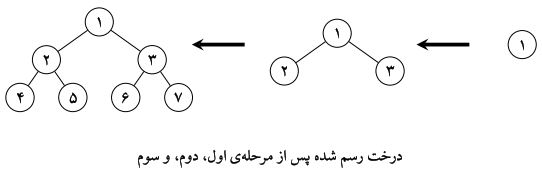 علی تصمیم گرفته است یک درخت ریشهدار دودویی رسم کند. او در مرحلهی اول یک راس روی کاغذ رسم میکند و شمارهی $1$ را به آن نسبت میدهد. سپس در هر یک از مراحل بعدی، به ازای هر راس درخت مرحلهی قبل، مانند راس شمارهی $x$، که درجهی آن کوچکتر یا مساوی یک است، دو راس جدید اضافه میکند و آنها را به راس شمارهی $x$ متصل میکند. سپس به یکی از دو راس جدید، شمارهی $2x$، و به دیگری شمارهی $2x + 1$ را نسبت میدهد.